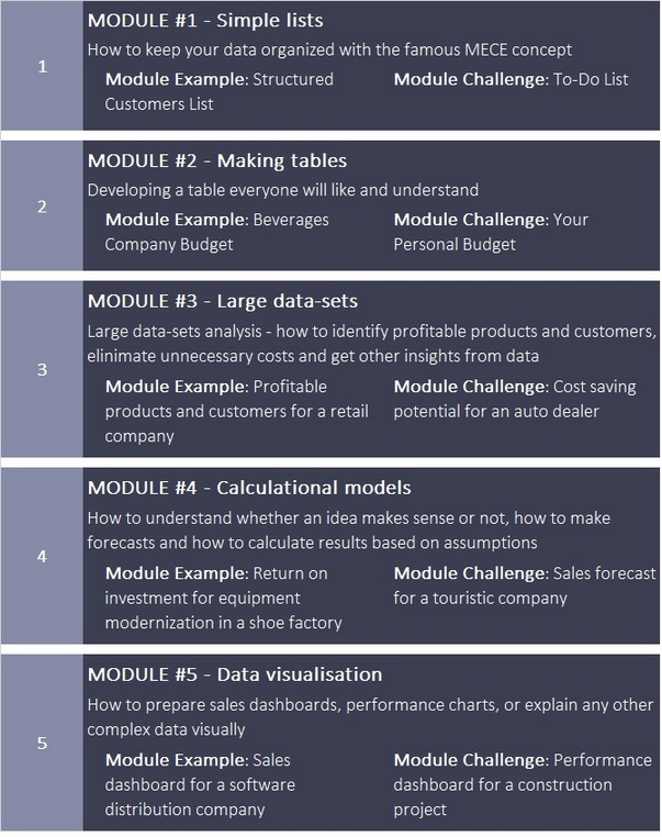 We'll go through 5 modules and 12+ hours of hiqh-quality video content prepared for you to get a comprehensive MS Excel skillset. You will learn by doing real examples from the business environment.